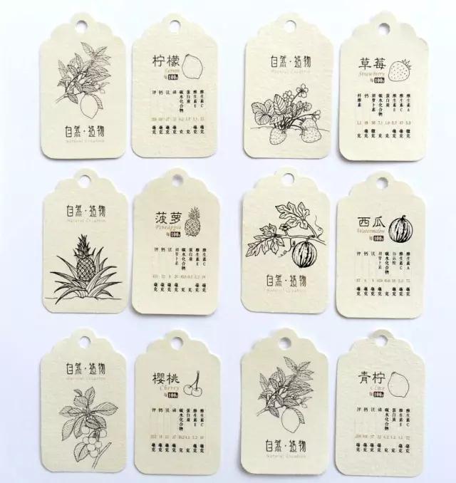 標簽——畫出了每種水果的生長形態(tài),標簽背面是水果的營養(yǎng)價值。人們可以通過這個標簽來了解水果,等于上了一堂生物課??!