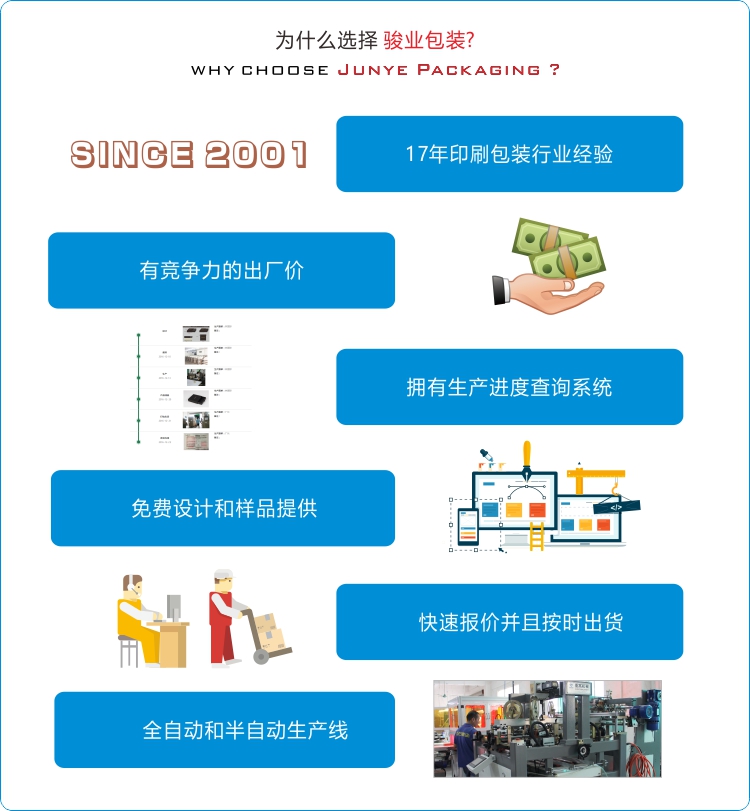 廣州駿業(yè)包裝實業(yè)有限公司創(chuàng)建于 2001年,是一家以印刷包裝制品為主營業(yè)務的集設計、生產(chǎn)、銷售為一體的一般納稅企業(yè),主要生產(chǎn)各種精品包裝盒、紙袋、吊牌,其主要應用于服飾、皮具、化妝品、保健品、禮品、首飾、茶葉、酒類、電子產(chǎn)品及其它日用制品等行業(yè),并通過了德國萊茵認證、BV認證、SGS認證和WCA認證.