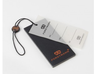 此款衣服吊牌制作采用黑卡紙,商標燙紅金,加上一張PVC塑料片。